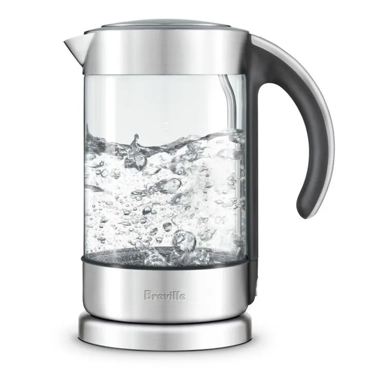 Elegant glass kettle with soft open lid.