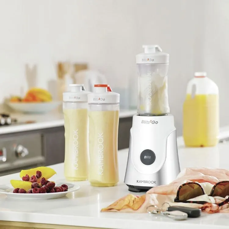 Blend and drink smoothies, juices and protein shakes from the same handy bottle with the Kambrook Blitz-2-Go Personal Blender. Great for home or on the move, take the Blitz-2-Go to work or the gym, it even fits in most car cup holders. Stainless steel blades make short work of fruits, seeds, ice, and more, ensuring smooth blended drinks.