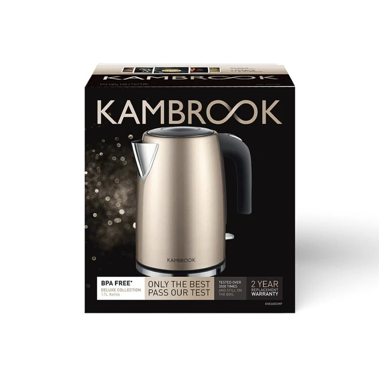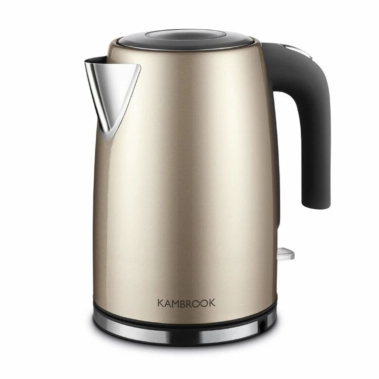 The Kambrook Deluxe Collection 1.7L Kettle is a masterpiece for your kitchen with its brushed champagne finish. It features a one-touch pop-up lid for your convenience, as well as boil dry protection, a water window and concealed element. Additional features include a large water spout for easy pouring and a contrasting grip handle.