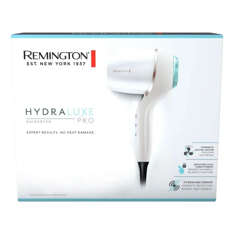 Dry your hair beautifully and healthily with the Remington Hydraluxe Pro Dryer. With its powerful hydra care sensor technology and powerful digital motor, this hair dryer not only dries your hair faster,m but also dries it without damage. It comes with an LED display with 3 heat and 2-speed settings, a 3m Salon length cord, an ergonomic design and various attachments to style your hair in different ways.