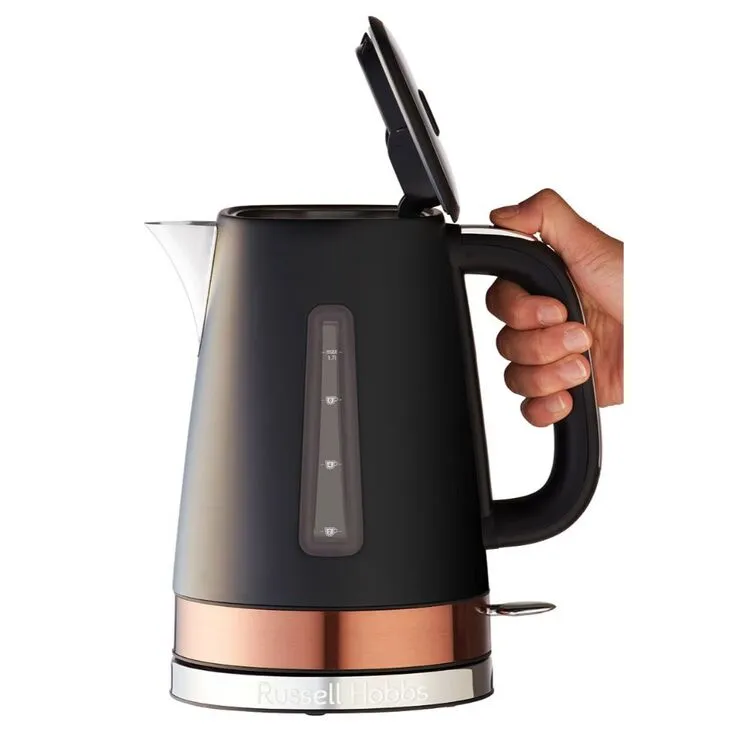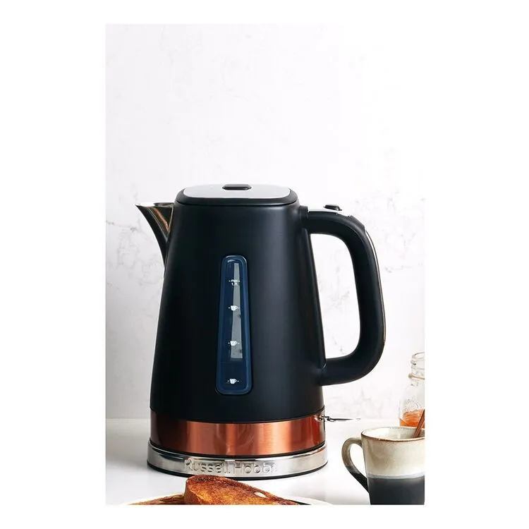 Sporting a matte black body with on-trend copper accents, the Russell Hobbs Brooklyn Kettle Copper blends sleek, modern style with understated functionality. Featuring a perfect pour spout, quiet boil technology, and a 360 degree cordless base, this kettle is easy to use, pour, and manoeuvre. A generous 1.7L capacity ensures more than enough for family and friends alike!