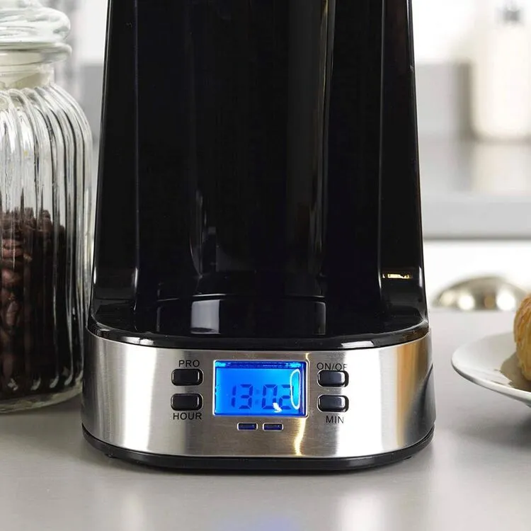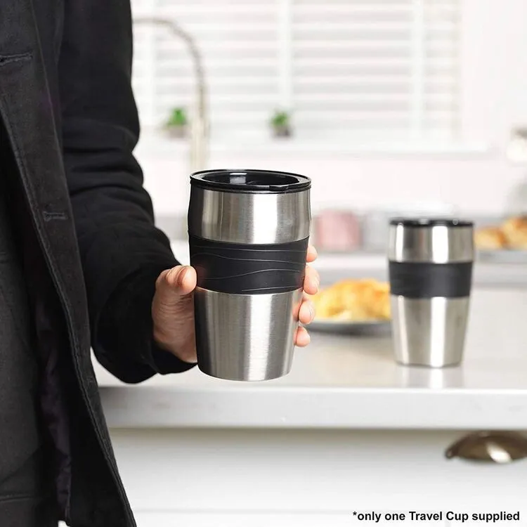 Make mornings the highlight of your day and whip up a delicious hot drink in no time with this handy Salter Digital Coffee Maker To-Go. Making coffee has never been so simple, this maker features a 24-hour programmable timer which is easily controlled using the digital control function, and has a contemporary design with sleek stainless steel accents. This 750W coffee maker is perfectly compact for easy movement, making it ideal for travel and work. It also doubles as a stylish and convenient travel mug which has a silicone grip to ensure ultimate comfort whilst on-the-go.