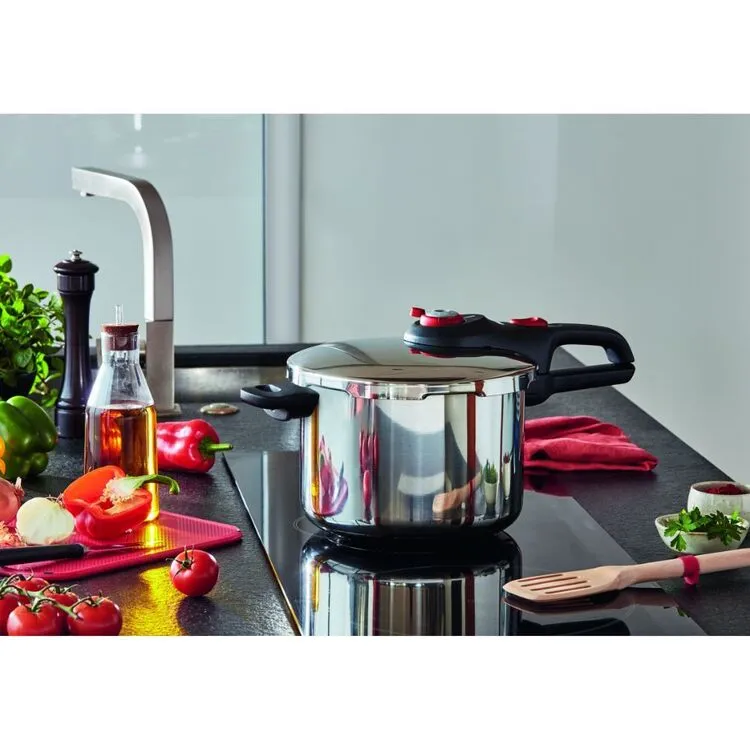 Rich in security, rich in taste and built to last. Available in 6L and 8L sizes, the Tefal Fast & Easy Induction Stainless Steel Pressure Cooker is a pressure cooker designed with safety as the key element, delivering exceptional results with total peace of mind. It features an exclusive 5-point security system that ensures the safest way to cook, while two separate cooking programs offer the perfect temperature for a wide variety of ingredients and flavours.