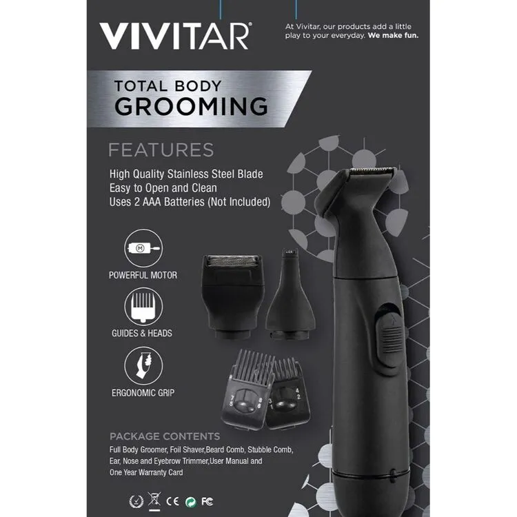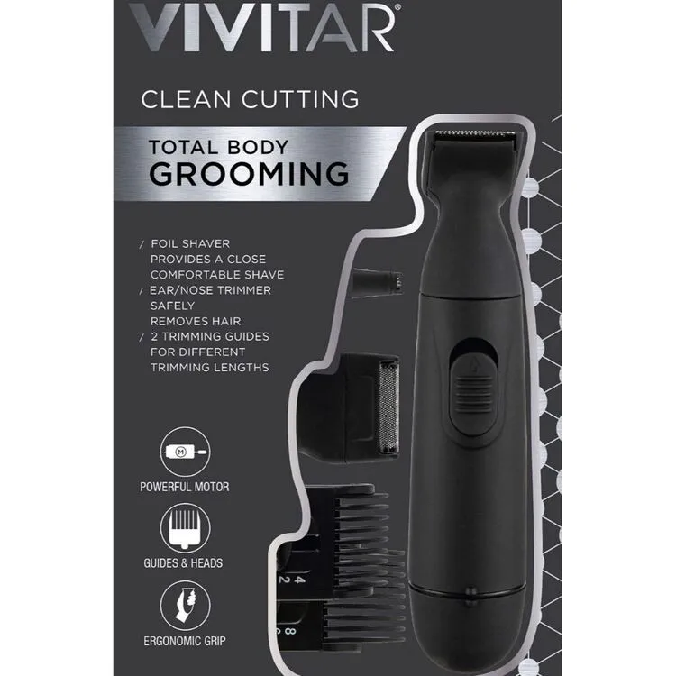 Receive the perfect close and comfortable shave with the Vivitar Total Body Grooming Tool, designed with high quality stainless steel blades to deliver a smooth, even shave without irritation. Featuring an ergonomic grip, compact design, precision foil shave and an ear and nose trimmer attachment, achieve full body grooming with the Vivitar Total Body Grooming Tool.